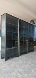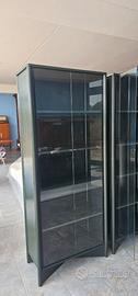 petrolio opaco,finitura a poro aperto,inserti in metallo laccato nero,vetro temperato sulle porte e schiena in legno verniciato