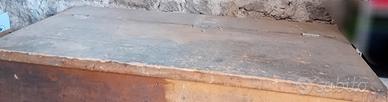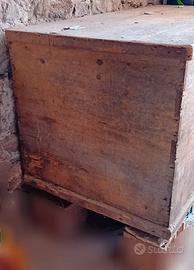 Vendo cassone in legno di castano anni 40 in buono stato ma da restaurare, misure lunghezza 2 metri - altezza 1,05 metri - profondità 1 metro. Il cassone è munito di coperchio incernierato. Dagli anni 40 agli anni 80 è stato usato per lo stoccaggio del grano trebbiato o per le scorte di cereali, dagli anni 90 è usato come contenitore per le reti per la raccolta delle olive. L'interno è diviso in due scomparti.