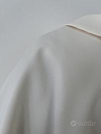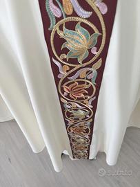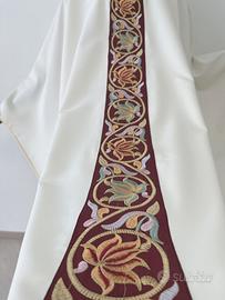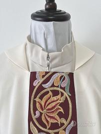 La casula è realizzata con un bel tessuto bianco avorio. È facile da stirare e mantiene bene la forma, senza stropicciarsi. Il mantello, dalla classica forma ovale, ha dimensioni standard: un'ampiezza di 150 cm circa e una lunghezza di 130 cm circa. La casula è rifinita da uno sbieco perimetrale dorato. La casula presenta un colletto quadro (detto Paolo VI) realizzato con lo stesso tessuto del mantello. La decorazione consiste in un bel gallone a tema floreale su sfondo rosso bordeaux. Il gallone è applicato sia sul davanti che sul retro della casula, dal collo al bordo inferiore. La casula è nuova ed è confezionata artigianalmente in Italia con materiali dignitosi e di ottima qualità, come richiesto per le vesti sacre adatte per le celebrazioni liturgiche. È completa di stola confezionata con lo stesso tessuto del mantello.