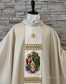 La casula è realizzata con un bel tessuto oro chiaro effetto lurex. Il tessuto utilizzato per la confezione è di ottima qualità e segue i movimenti del corpo in modo fluido. È facile da stirare e mantiene bene la forma, senza stropicciarsi. Il mantello, dalla classica forma ovale, ha dimensioni standard: un'ampiezza di 150 cm circa e una lunghezza di 130 cm circa. Il mantello della casula è rifinito da uno sbieco perimetrale dorato. La casula presenta un colletto a girocollo realizzato con lo stesso tessuto del mantello. La casula presenta, sia davanti che dietro, uno stolone confezionato in tessuto misto raso rifinito ai lati con uno sbieco dorato e al bordo inferiore con una frangia. La decorazione, a tema natalizio, consiste in un'applicazione ricamata a macchina che rappresenta la natività, 12 applicazioni a forma di stella a sei punte intervallate da un agremano oro (altezza 5 cm). La casula è nuova ed è confezionata artigianalmente in Italia con materiali dignitosi e di ottima qualità, come richiesto per le vesti sacre adatte per le celebrazioni liturgiche. È completa di stola confezionata con lo stesso tessuto del mantello.