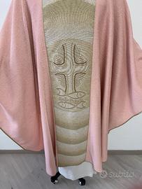 La casula è realizzata con bel tessuto rosaceo che presenta una particolare lavorazione, come si evince dalle fotografie. Il lato interno del mantello è morbido e liscio, per essere indossato comodamente e seguire i movimenti del corpo. È facile da stirare e mantiene bene la forma, senza stropicciarsi. Il mantello, dalla classica forma ovale, ha dimensioni standard: un'ampiezza di 150 cm circa e una lunghezza di 130 cm circa. Il mantello della casula è rifinito da uno sbieco perimetrale dorato. La casula è decorata sia davanti che dietro con un elegante gallone realizzato in fili dorati di varie tonalità con la tecnica dell'arazzo. Il soggetto richiama la croce e il tema dei pani e dei pesci. La casula presenta un colletto a girocollo realizzato con lo stesso tessuto del mantello. La casula è nuova ed è confezionata artigianalmente in Italia con materiali dignitosi e di ottima qualità, come richiesto per le vesti sacre adatte per le celebrazioni liturgiche. È completa di stola confezionata con lo stesso tessuto del mantello.