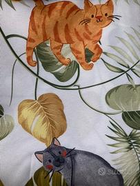 Vendo Tovaglia/copri tavolo no stiro, anti macchia, fantasia sui toni del verde con GATTI, profilo color verde oliva, misure: