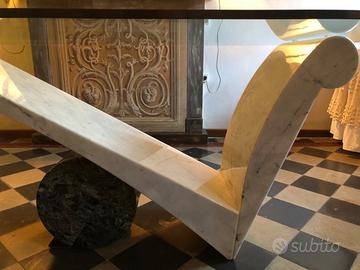 tavolo piano a forma ovale cristallo spessore 15 mm finitura trasparente, basamento marmo bianco Carrara cilindro marmo verde Alpi 220 x 100 altezza 72 nessun difetto o imperfezione