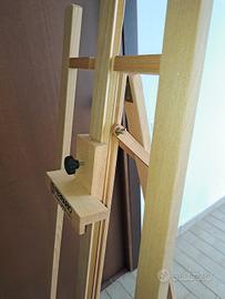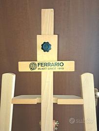 Cavalletto a lira Ferrario NUOVO in legno di faggio di qualita. Ideale per dipingere o come cavalletto da esposizione. È dotato di supporti scorrevoli poggiatela, molla interna anti vibrazioni, movimento di elevazione regolato da cremagliera. Richiudibile. Altezza circa 220 cm, apertura 70 cm, poggiatela 54 cm.