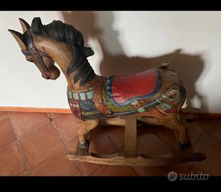 Cavallo a dondolo di fine ottocento, finemente intagliato e decorato. Colori originali.
