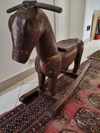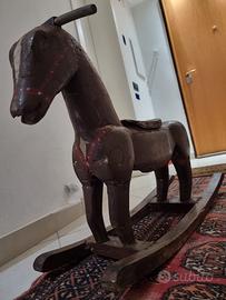 Prestigioso cavallo a dondolo in legno massello. realizzato e decorato totalmente in modo artigianale approssimativamente verso la metà del '900. Misure: altezza cm. 56, lunghezza x. 78, larghezza cm. 28. altezza al garrese cm. 32. Prezzo trattabile.