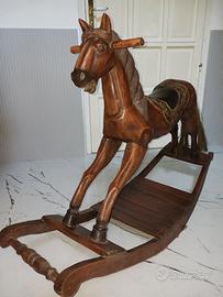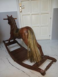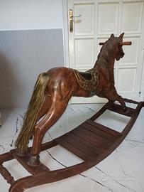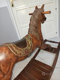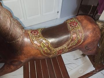 Cavallo a dondolo in legno finemente intarsiato a mano. Ricami fiorati sulla sella, coda del cavallo in fili di paglia doppi ( effetto crine ).