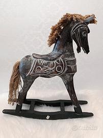 Bellissima scultura in legno di un cavallo a dondolo, con coda e criniera in corda. Misura cm 34 x 37 altezza.