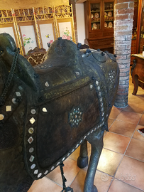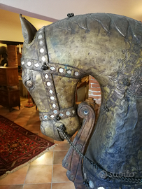 CAVALLO INDIANO SU BASE LIGNEA RIVESTITO DA LAMINA DI BRONZO E RAME. PEZZO UNICO. MISURE 167H /170L/41P