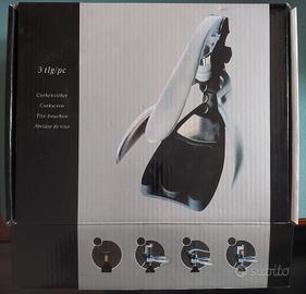 Cavatappi/apribottiglie vino professionale, mai usato, come nuovo. Composto in tre pezzi, agisce in 4 secondi, rilascia il tappo in poco tempo; il design high-tech evita la rottura del tappo. Realizzato in zinco e acciaio temprato.