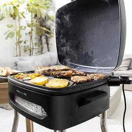 Barbecue elettrico con tecnologia PowerGrill e piastra in alluminio pressofuso con rivestimento RockStone per evitare che il cibo si attacchi.