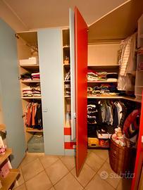 Cameretta completa di armadio con cabina, scrivania, letti scorrevoli impilabili, mensole. Pensili.