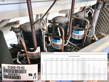 centrale frigo Scroll usata, si tratta di una unità frigo con tre Scroll di marca Copeland mod. ZF15K4E-TFD-551 con una resa a -10° espansione 45° di 8.00kw cad. per un totale di 24.00kw adatto per gruppi di celle da 240/300m³. manca il condensatore.