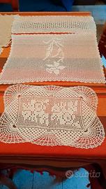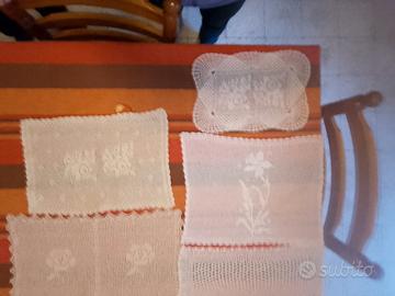 5 centrini fatti a mano ad uncinetto colore ecru di diverse dimensioni.