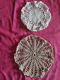 44 centrini, 4 écru in cotone, 40 bianchi, fatti a mano all'uncinetto, motivi assortiti. Diametro da 15 a 19 cm circa. Adatti come applicazioni o inserti per tende, copertine e cuscini, bomboniere dal sapore retro, o da soli per arredamento vintage. 30 centesimi l'uno, 10€ tutti