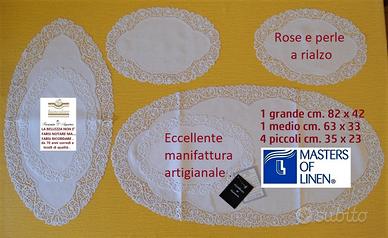 Proponiamo esclusivissimo completo centri 6 pezzi colore bianco lavorato a mano in pizzo tombolo e cantù tempestato di rose e perle a rialzo ( MASSIMA ESPRESSIONE DI QUESTA LAVORAZIONE ) .
