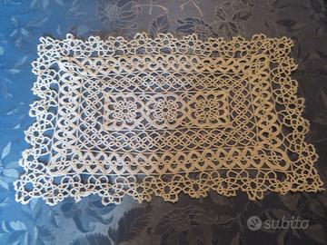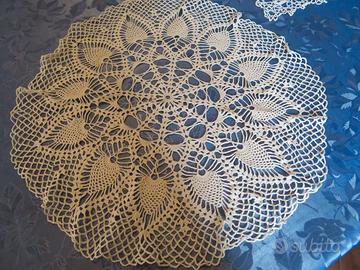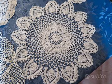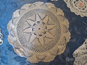 Set di 5 centrini di varie misure e dimensioni lavorati a mano a uncinetto. Il set è composto da: - 1 centrino rotondo grande colore ecrù - 1 centrino medio bianco - 1 centrino rotondo piccolo nocciola - 1 centrino lungo bianco con roselline rosa - 1 rettangolo piccolo bianco.