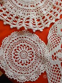 19 centrini misure varie, quasi tutti fatti a mano all'uncinetto oppure ricamati o con inserti, cotone bianco, avorio, ecrue, più una tovaglietta fatta a mano con foderina rosa cm 70x90 circa. Tutto usato ma in ottime condizioni, necessita solo di una rinfrescata ed eventuale inamidatura.