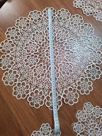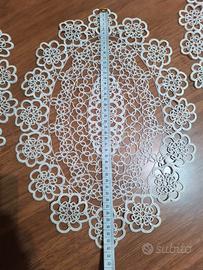 Set di 6 centrini lavorati completamente a mano, uno grande tondo, tre ovali medi e due ovali piccoli, colore bianco. Misure sulle foto.