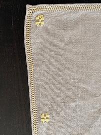 Centrino/centrotavola/runner vintage rettangolare cm. 76x31 ecrù, con ricami pieni e norvegesi nei colori giallo e sabbia. Bordo a giorno.