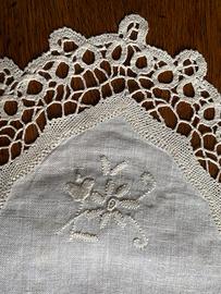 Centrino o coprivassoio in pizzo di Cantù e ricamo