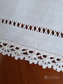 Raffinato centrino rettangolare di cotone bianco con inserto e bordo all'uncinetto. Tutto fatto a mano. Nuovo mai usato. Misure 25 x 35 cm
