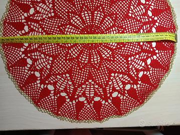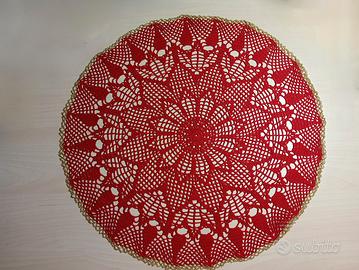 Centrino rotondo rosso in cotone con bordo dorato, realizzato all' uncinetto.