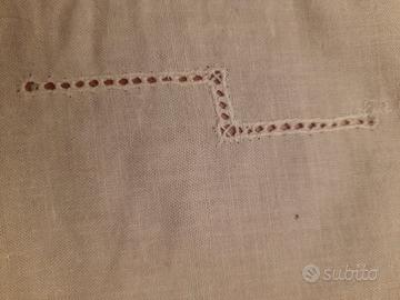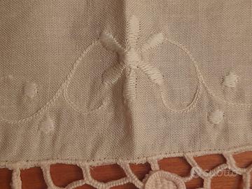 Bellissimo centro antico ricamato su lino ecru' a punto pieno, punto ajour, punto erba, e rifinito ai quattro lati in elegante pizzo in cotone fatto a mano.