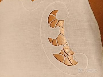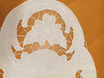 centro tavola bianco in lino ricamato a mano p.festone intagliato misure 84x33