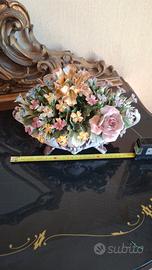 centrotavola in porcellana di Capodimonte, caratterizzato da una ricca composizione di fiori multicolori modellati a mano.