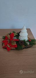 Elegante composizione natalizia realizzata su una base in legno naturale.✨️ Al centro spicca una candela di soia, profumata di pino, a forma di albero di Natale, color bianco, affiancata da dettagli stagionali come pigne vere, rametti di abete sintetico e bacche rosse decorative.
