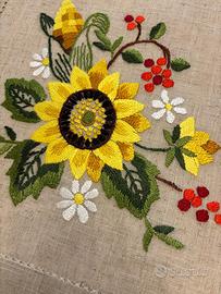 Centro tavola in tessuto di misto lino e poliestere a fondo di colore ecru’, impreziosito dí copioso ricamo a mano eseguito con la tradizionale tecnica del punto pieno, apprezzata per bellezza e precisione.