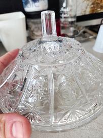 Questa è unabonbonnière(porta caramelle o centrotavola) incristallovintage con lavorazione sfaccettata, spesso associata a stili classici come quello boemo. Materiale:Cristallo/vetro di alta qualità abbastanza spesso e pesante. Stile:Vintage, tipicamente caratterizzato da motivi a stella o motivi geometrici intagliati. Utilizzo:Ideale come elemento decorativo, contenitore per caramelle o come idea regalo raffinata. Manutenzione:Si consiglia il lavaggio a mano per preservare la brillantezza del cristallo. Ritiro Aranova su Aurelia RM
