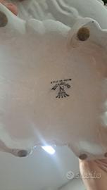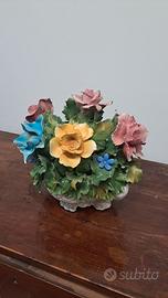 Questo è un bellissimo centro tavola in porcellana Capodimonte, come si può vedere dal marchio sulla base. L'oggetto presenta una complessa composizione floreale, con un mix di fiori in colori vivaci come rosa, giallo e blu, sapientemente disposti tra foglie di un verde brillante. Il tutto è contenuto in un vaso decorato con volute. I dettagli e la lavorazione sono squisiti e tipici dell'artigianato italiano di alta qualità. È un pezzo perfetto per chi colleziona porcellane o cerca un elemento decorativo d'impatto per la propria casa.
