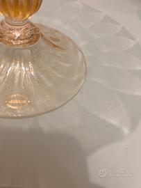 Centrotavola in vetro soffiato di Murano, caratterizzato da un colore ambrato e lavorazione a coste e con inclusioni d'oro.