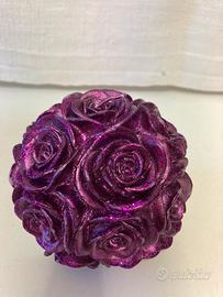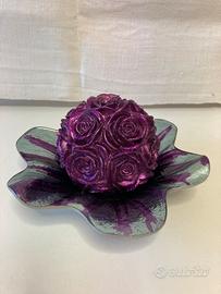 Centro tavola in vetro sfumato + candela abbinata a forma composizione floreale. L’oggetto non e’ mai stato usato ma, causa non idonea sistemazione della candela, alcuni fiori presentano qualche modesta graffiatura sul bordo di alcuni petali come si vede in foto.