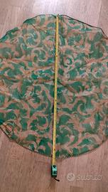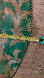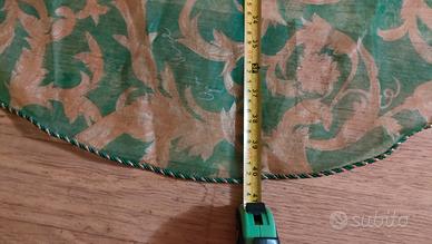 Ecco un centro tavola trasparente che lascia intravedere il legno o altro materiale. Molto grazioso il bordino intrecciato oro e verde. Nuovo. Vintage