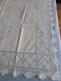 Tovaglietta centro tavola di cotone bianca, con inserto centrale, e bordi laterali, lavorati a uncinetto.