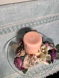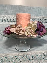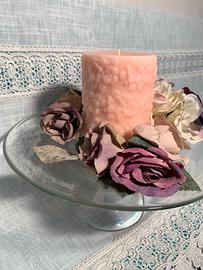 Bellissimo centro tavola o sopra mobile in pregiato vetro misure diametro 28cm altezza 15cm più candela diametro 9cm altezza 14cm colore rosa e fiori di decoro Articolo da esposizione