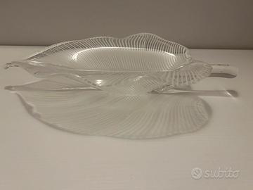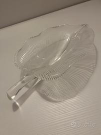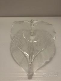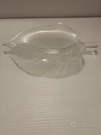 Centrotavola a forma di Foglia in Vetro di Murano anni 70, il centrotavola è in perfette condizioni ed non presenta segni di usura , presenta delle 2 piccole bollicine al interno del vetro che sono dovute alla soffiatura del vetro (vedere foto) ma che non compromettono minimamente la sua integrità, è stato prodotto in una vetreria di Murano dove fu direttamente acquistato, le misure sono 38 cm di lunghezza 22 cm di larghezza e 9 cm di altezza.
