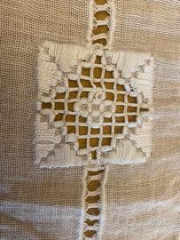 Elegante centrotavola in tessuto bianco, molto antico, perfetto per aggiungere un tocco di raffinatezza alla tua tavola o come elemento decorativo.