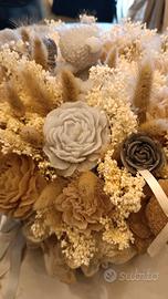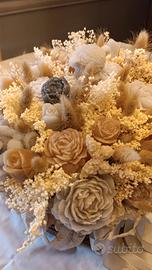 Centrotavola con scatola invecchiata e decorazioni a cera, raso e trina