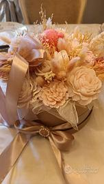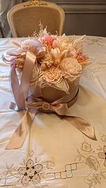 Centrotavola con scatola e decorazioni in cera profumata, raso e trina
