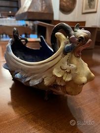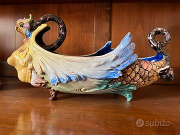 Raro Centrotavola "Barca" Mostro Marino – Ceramica Artistica – Vintage Anni '50 Affascinante e raro centrotavola in ceramica policroma raffigurante un mostro marino mitologico (foggia a barca). L'oggetto è un tipico esempio di alta manifattura artigianale italiana della metà del secolo scorso, caratterizzato da un design dinamico che fonde elementi barocchi e fantastici. Dettagli dell'opera: • Soggetto: Creatura mitologica zoomorfa con squame dettagliate, coda arricciata e un'espressiva testa di dragone/rapace. • Lavorazione: Ceramica smaltata con vivaci toni di blu cobalto (interno), ocra, verde e sfumature brune. • Effetto Craquelé: La superficie presenta una naturale cavillatura dello smalto che ne certifica l'autenticità e l'epoca. • Stile: Gusto Barocchetto / Neorococò. • Epoca: Anni '40 - '60.