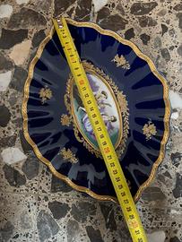 Elegante centrotavola ovale in porcellana con bordo ondulato color blu cobalto e decorazioni in oro zecchino. Al centro un’immagine romantica in stile rococò, contornata da motivi floreali dorati. Sul retro è presente un’etichetta “Novità Mary - Limoges France”, suggerendo ispirazione o stile Limoges, anche se non è chiaro se sia una produzione originale francese o italiana ispirata al design Limoges.