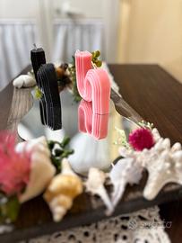 centrotavola con base in legno naturale, rivestito con specchio. Decorazioni con conchiglie naturali fiori artificiali e candele profumate. Adatto per un arredamento classico e moderno