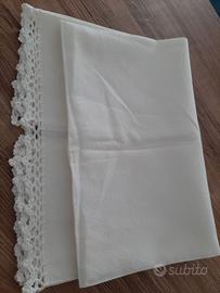 Vendo centrotavola/tovaglietta rettangolare bianca. Nuova. Realizzata artigianalmente da mia madre con una stoffa leggera, puntinata. Ha un doppio bordo in pizzo alto, ovviamente su entrambi i lati, due centimetri. Il solo telo, senza contare il pizzo, misura 79 x 55 centimetri. Perfetta.