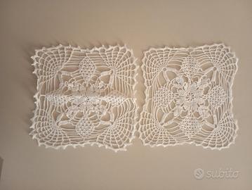 meravigliosa tovaglietta centrotavola con centrini abbinati, totale 5 pezzi, fatti rigorosamente a mano all'uncinetto in cotone bianco. la tovaglietta misura cm 85 x 26. poi ci sono 2 centrini rettangolari da cm 33 x 18 e poi ci sono 2 centrini quadrati cm 18 x 18