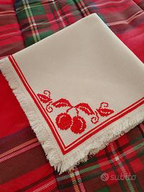 Centrotavola quadrato, misura circa 46x46 cm, ricamato a mano con la tecnica punto croce, perfetto anche il rovescio della tovaglietta, il motivo è molto bello - le ciliegie rosse.