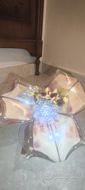 Oggetto di cristallo d' arredo vintage che si innesta molto bene in arredamenti anche moderni. Opera in vetro soffiato forgiato a mano da maestri vetrai officine venete Muranesi Centrotavola in vetro di Murano a forma di fiore , con decorazioni floreali gialle con un inserimento di un fiore centrale di pietre di cristallo taglio brillante verosimilmente Swarovski a centro con un buche' di altri fiori in cristallo colorato
